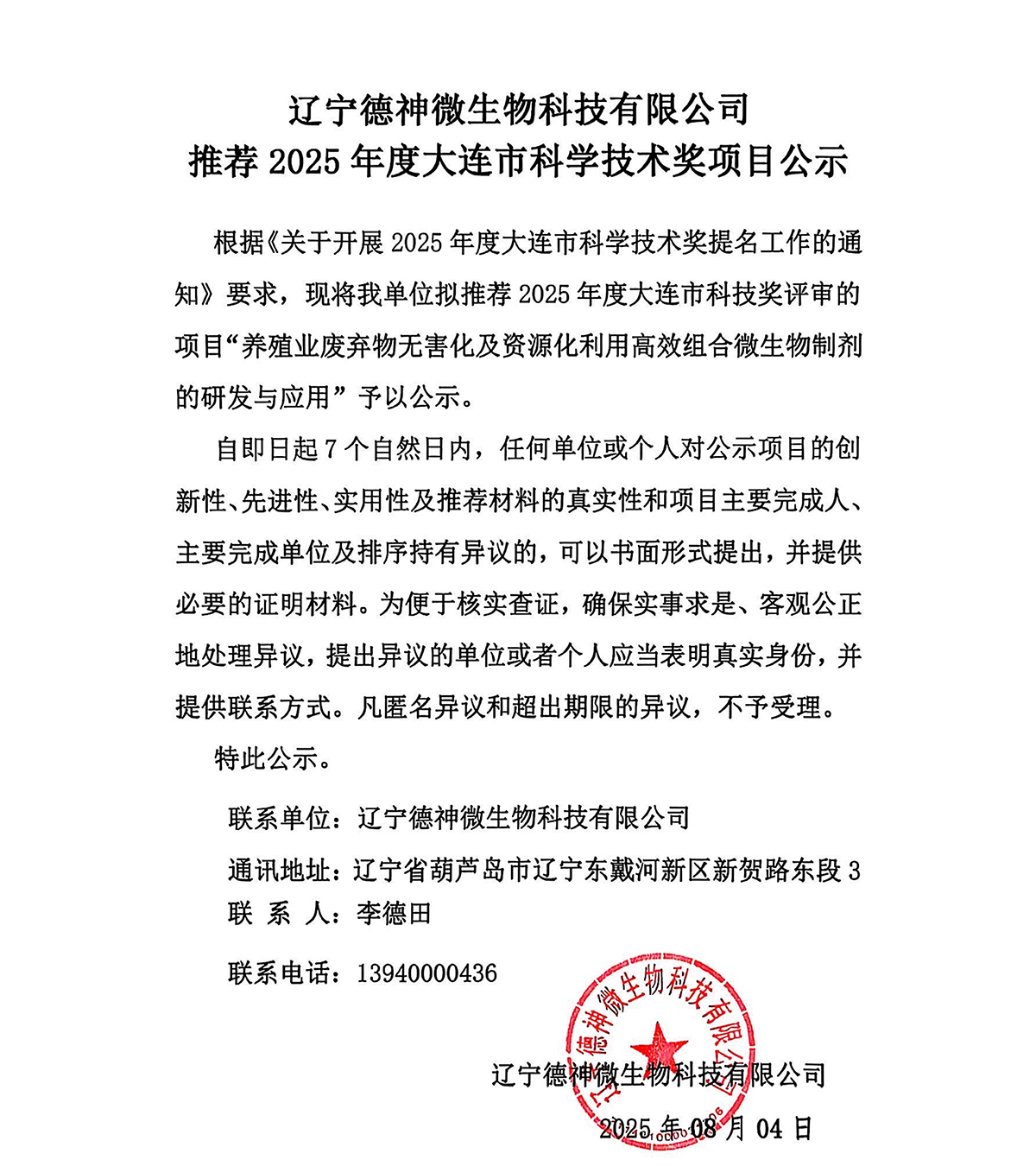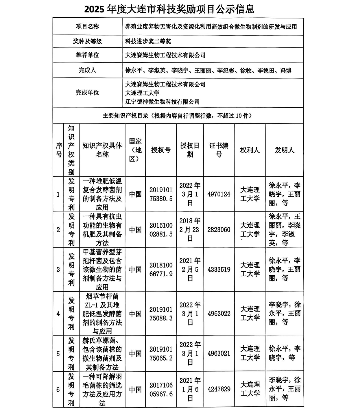 遼寧德神微生物科技有限公司推薦 2025年度大連市科學(xué)技術(shù)獎(jiǎng)項(xiàng)目公示